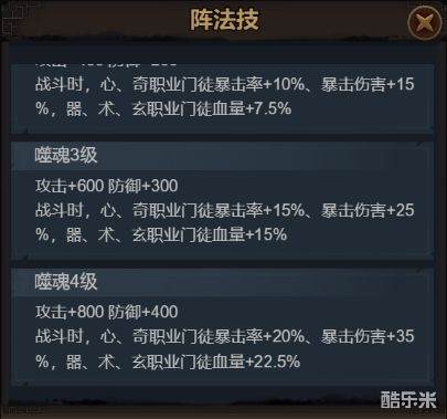 两仪清风阵:战斗时1,2,4号位门徒受疗效果+7%,3,5号门徒治疗加成+7%治疗阵法,个人认为这个阵法带通用技增伤是最好的,目前还没有研究出一套好的阵法技阵容,在这个阵法上如果有好的阵容搭配大家可以在评论区留言我们一起探讨。