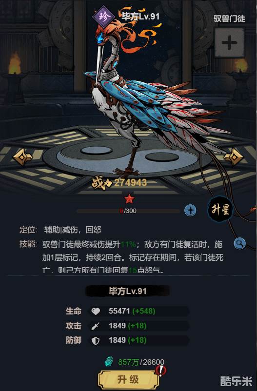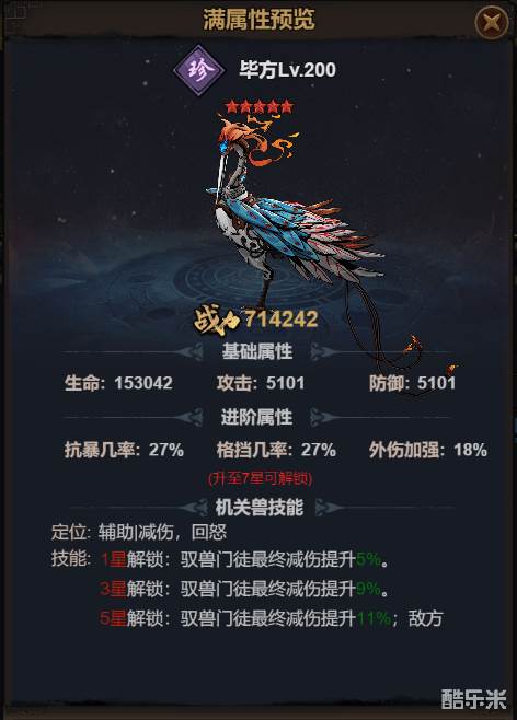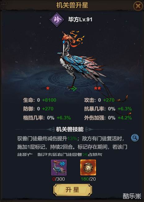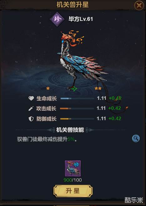 机关兽毕方技能主要增加驭兽门徒附加减伤能力,格挡几率,适合肉盾前排门徒佩戴。