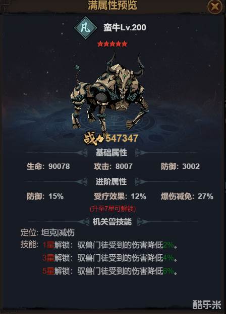 搭配门徒:荆无云、云高寒等机关兽蛮牛对驭兽门徒受到伤害降低,适合防御型门徒携带,增加了防御门徒的持续战斗能力。