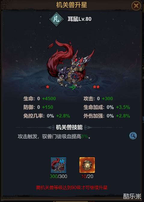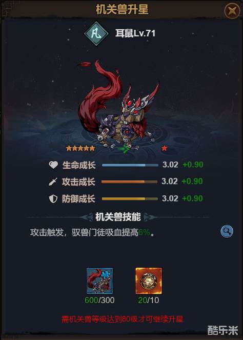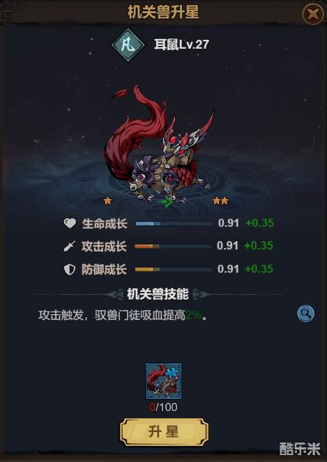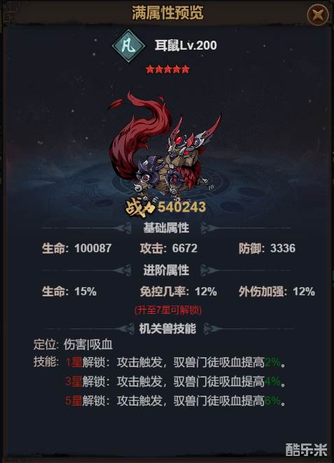 3:6星后升星机关兽会增加生命百分比、免控几率、外伤加强。