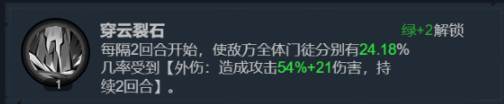 穿云裂石:每阁2回合开始,使敌方全体门徒分别有24.18%几率受【外伤:造成攻击54%+21伤害,持续两回合】。外伤状态搭配外伤阵容可以打出很可观的伤害。每升1级基础值都有所增加(修炼绿+2解锁)。