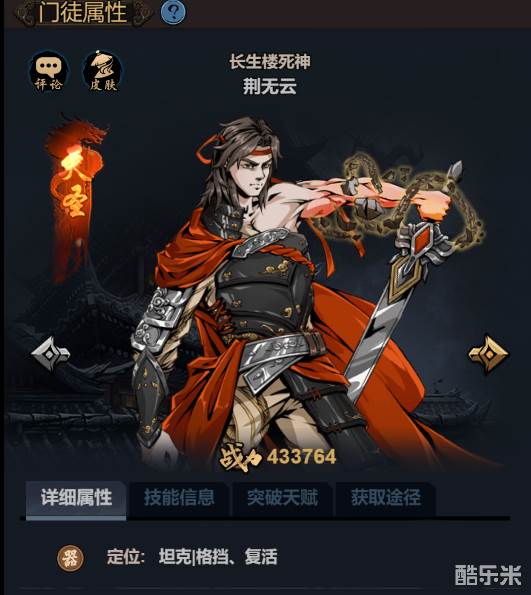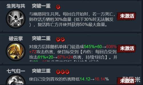 七气归一:使自己受到普攻的伤害降低14.12%(数值随着技能升级有所变化修炼绿+2解锁)伤害降低百分比荆无云可以放在前排做一个坦克专用。