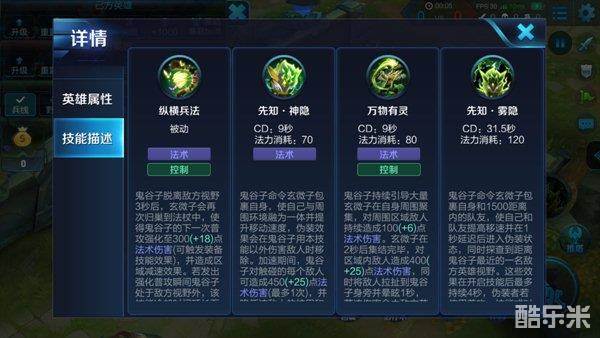 纵横兵法:鬼谷子脱离敌方视野三秒后,玄微子回再次归巢到法杖中,使得鬼谷子的下一次普攻强化,完成法术伤害并且可以触发攻击特效,造成区域减速效果。若发出强化普工瞬间,鬼谷子处于敌方视野外。该技能冷却时间延长至十秒。被动技能使得鬼谷子可以造成群体伤害,并对敌人造成范围性减速,鬼谷子可以使用该技能进行先手开团。