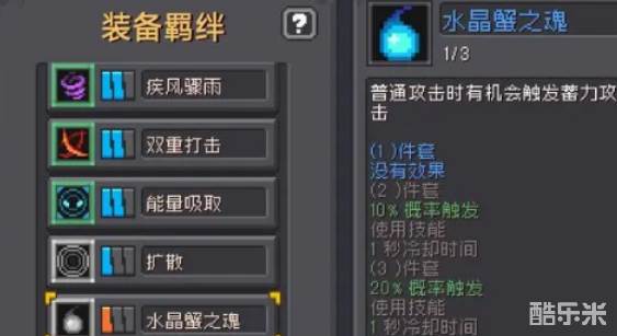 就比如其中有个装备羁绊叫做水晶蟹之魂,可以让角色在普攻的时候有一定的几率会触发蓄力输出,在你们获取到多件套的时候能够提升会触发的概率,同时会在使用技能之后降低冷却时间。