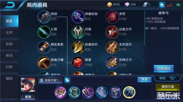 六神装推荐:巨人之握、抵抗之靴、暗影战斧、冰痕之握、魔女斗篷、破甲弓