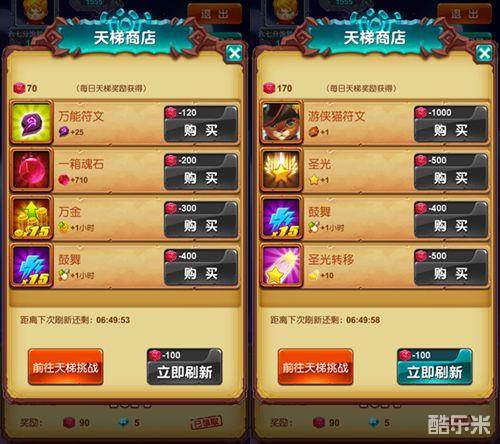 天梯商店作为游戏中的主要商店之一,勇者们在这里可以购买金币,魂石,万能符文,祝福等,虽然刷新道具需要消费100点荣誉值,但是对于经常驰骋在天梯赛场的勇者们来说,这完全不足为道。只要实力增高了,荣誉值的获得将大大提高,更可以让勇者们尽情的畅游在天梯商店之中。