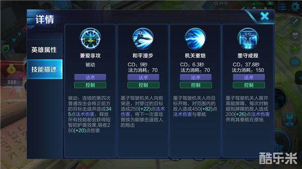 解析:墨子的范围性团控技能,一名合格的墨子玩家至少可以在一场团战中利用三技能控制住两名以上的敌方英雄。该技能既可以保护己方后排亦可协助己方刺客突袭敌方后排。