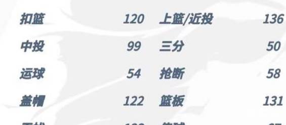在属性方面大致可以了解到的是,这方面基本都是跟篮球赛场上人员定位和实力相关的,而此处说明的这个角色主要强势的地方就是内线进攻和防守方面,同时在外线的干扰能力也不错。