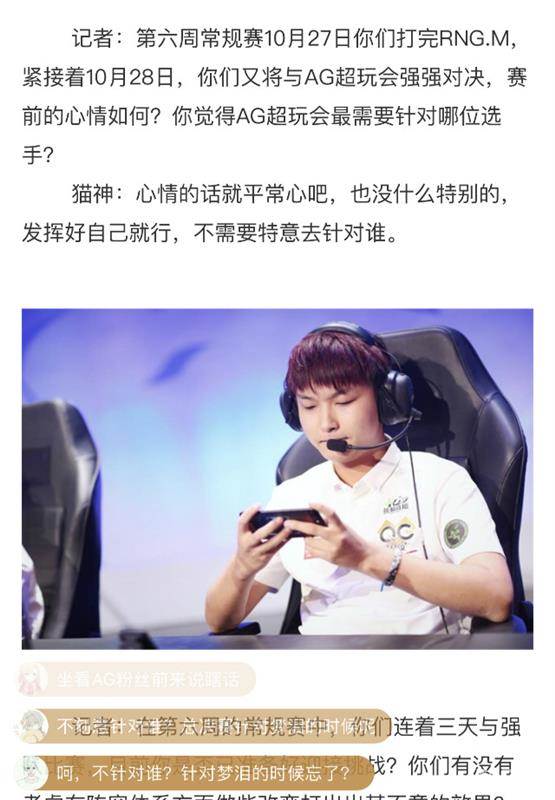 在KPL秋季赛常规赛第六周比赛开赛前,我们曾专门采访到QGhappy.Cat,让他谈一谈对接下来比赛的个人看法,在问到觉得对阵到AG超玩会最需要针对哪位选手时,Cat的答案是:“发挥好自己,不需要特意去针对谁。”这句答复引来了部分网友的极度不满,他们觉得QGhappy始终在针对AG超玩会.梦泪。