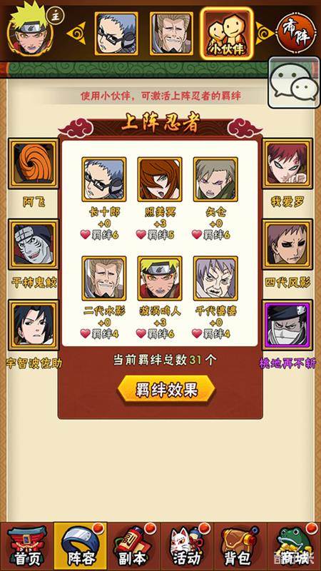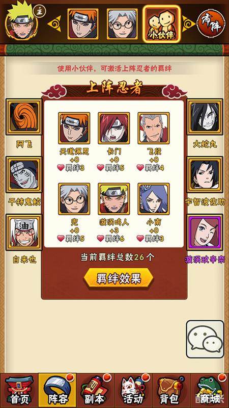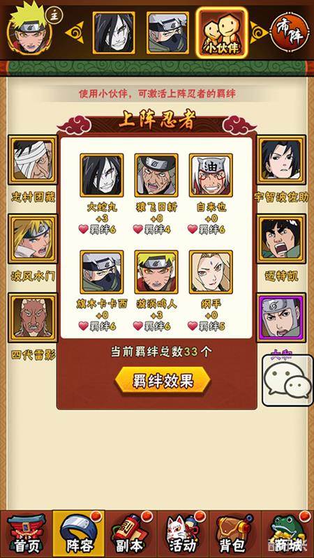纲手、大蛇丸、自来也作为木叶传说中的三忍,三人同时上阵将激活“木叶三忍”的羁绊,为三人同时带来20%的生命值提高、20%的攻击力提升。而卡卡西与猿飞日斩、迈特凯、波风水门都存在羁绊,志村团藏与猿飞日斩、佐助与大蛇丸、大和与卡卡西同上阵,也将激活羁绊,带来强大的属性加成。该阵容极大地激活了忍者间的羁绊,必然带来最强的战斗力!