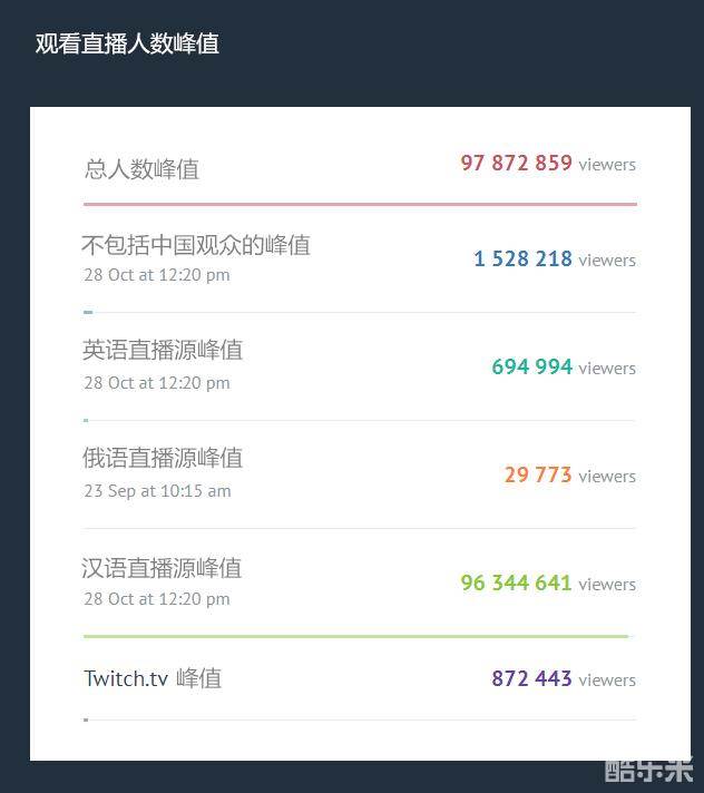而在另一项分场观看人数的统计中,最受欢迎的比赛基本上与中国队伍相关。这也从另一方面佐证,中国观众在这次全球总决赛上的主力军地位。不过去除中国观众和包括中国观众的排行稍许有些不同。