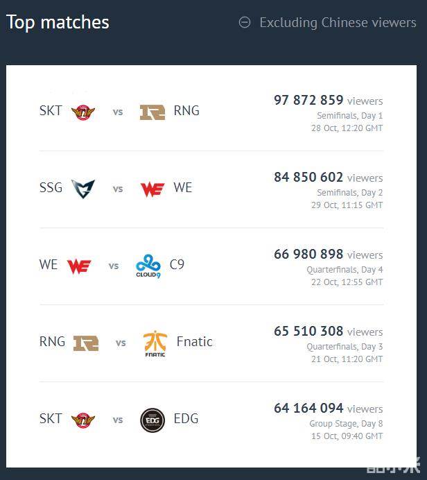 不包括中国观众的最受欢迎比赛排行中,最受外国观众关注的还是SKT与RNG的大战,接下来则是SKT大战兔子队的比赛,C9 vs WE和FNC vs RNG的两场四分之一决赛分别排在3、4位,SSG与WE的半决赛则排到了第五。