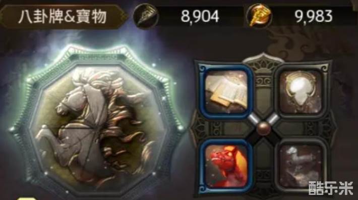在游戏当中,宝物主要分为四种,基本的武器,方牌以及马匹和玉玺。每一种都对应着相应的思维属性,把宝物装配在八卦牌上面可以额外提升角色的能力。需要注意的是,八卦牌方面至少有刻印一个以上的八卦牌才能装宝物。