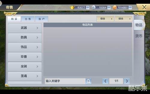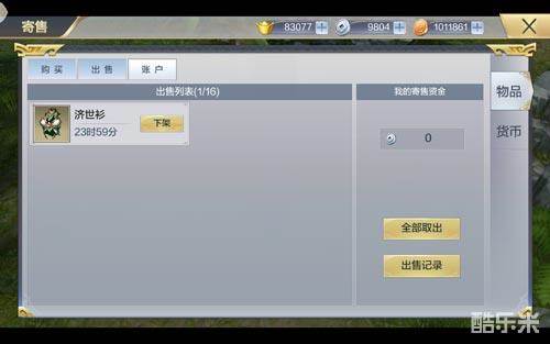 出售物品,点击右边物品栏内的物品,设定单价以及数量即可开始寄售。注意设定的价格是单件物品的价格哦,而且价格的制定有所限制,防止恶意抬价出售,赞!上架商品持续24小时哦,可自行下架。