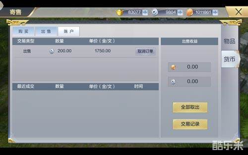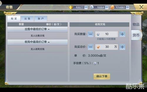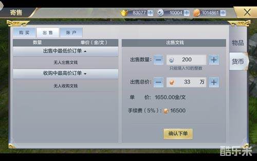 出售货币,选择出售的数量,以及总价即可出售文钱啦!注意定价合理,不然就没人买咯!