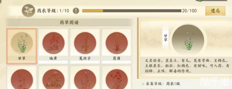 点击学习药农之后,就能够看到有当前药草图谱,每一种图谱都对应着不同地图和需要等级。例如刚刚学习等级只有一级,只能去大理采集甘草,在采集时候还会有伴生产品出现,有蓝色和紫色两种品质。采集药材不同,伴生出现产品也有着很大区别,例如采集甘草伴生的是山茱萸和何首乌,而采集红景天伴生的就是川贝和人参。这些都能在图谱中清楚看到,根据需要去不同地图采集。