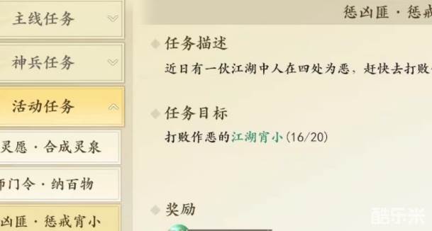作为游戏中每天必做单人活动,全天时间都可以参与其中,主要就是去和各种宵小战斗,战斗胜利之后就能获得宝图。这项活动特点是没有发布任务的NPC,在活动界面中选中之后,直接点击参与就会传送到第一环怪物所在地。参与到其中其实就是战胜对方,而后获得相关奖励。并不是所有战斗胜利之后都会得到宝图有一定几率。