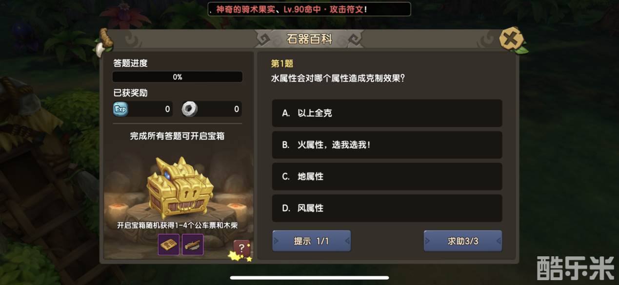 推荐理由:动动手指,经验、道具等直接送!相信“石器百科”是《新石器时代》里最简单的获取经验途径了,这对新手而言,这项日常是必做之一!每日可以进行10次百科答题,只要答对题目都能获得经验值以及石币,如果回答完所有题目这可以领取额外宝箱,还可以获得家族红包,当等级达到50级之后,若答题过程中出现回答错误,石币将会减少50%,不过驯兽师每天可以向家族成员救助3次,如此简单的日常任务,所以该项任务请勿错过啦!