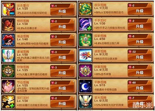宝物为勇士提供海量攻击力的成长,是勇闯魔王洞的坚实基础。前期建议每个宝物的升级点到为止,只需开启专属被动技能,尽量开启新的宝物,待最后一个宝物“死神之镰”开启时,轻轻松松突破三百大关。打宝赚钱升镰刀,战力飙升斗魔王。