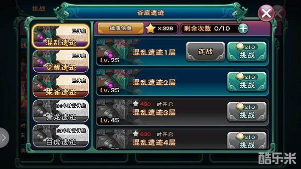 谷底遗迹副本有多个等级可以挑战,越高级的副本掉落的材料越多,不同的副本需要达到的等级、副本星数也不同。达到上面的两个条件,只能是有资格挑战,同时还要保证有足够的战斗力,副本需要打掉三拨怪物,前面两拨是普通的,最后一拨是boss。