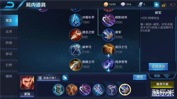 六神装推荐:抵抗之靴、红莲斗篷、暗影战斧、冰痕之握、魔女斗篷、破军