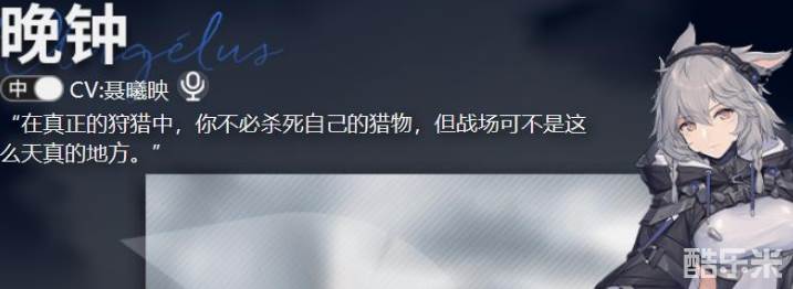 晚钟是一名岁数不大的少女角色,因为具有亚地利人的血统,故而长这可爱的兽耳,但可千万不要小瞧她,在背景故事中她是组织中任务完成率最高的特请,而在游戏中她也是当之无愧的T0级别的输出手,被动技能无视敌方防御,造成的伤害几乎和真实伤害一样,这让她在boss战中有着出色的表现。