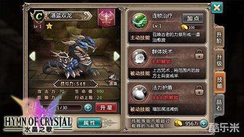湛蓝双龙共有三个技能,初始技能连锁治疗可以召唤古老的力量形成一道治愈波,治疗友方单位。升到B阶将解锁被动技能群体妖术,上古咒术可以将范围内的敌方士兵变成羊。升至AAA阶将解锁被动技能法力护盾,可以增加魔法减伤。