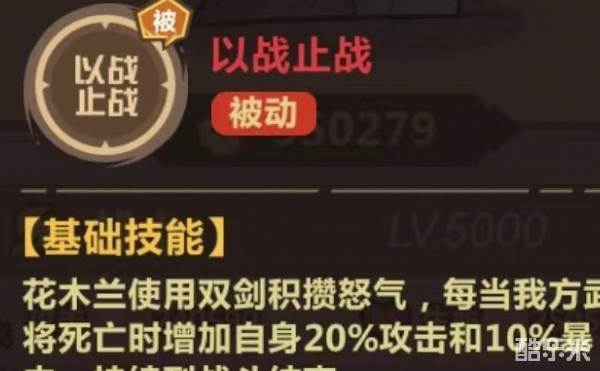 第2个被动技能以战止战,效果是使用自身手中的双剑快速积攒怒气,每当我方有武将阵亡时,自身都能获得20%攻击和10%暴击提升。提升之后一直持续到战斗结束,获得这两项属性提升之后的花木兰才真正成为输出比较狂暴的角色,也是战斗后期能够发挥出优势的原因所在,但一定要保证能存活到后期,所以最好搭配上治疗角色一起使用。