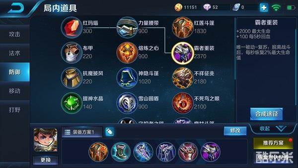 六神装:红莲斗篷、抵抗之靴、冰痕之握、魔女斗篷、反伤刺甲、霸者重装