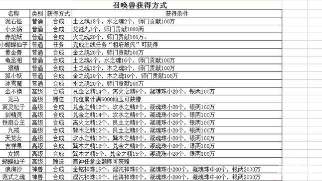 大话西游热血版召唤兽怎么合成 召唤兽合成材料表