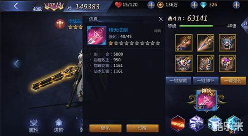 每件装备可以通过强化来提升装备效果,能强化的最高等级与等级同步。并且,每件装备也可通过神界星石来升星,最高为10星,其中,神界星石可以通过宝阁抽取或者兵魄兑换来获得。