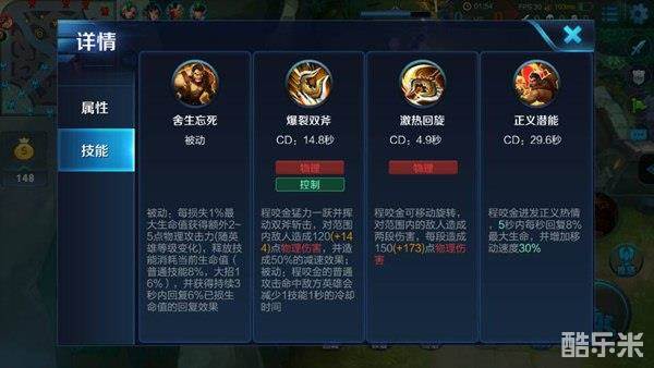 一技能需要灵活运用,一技能是程咬金重要的位移技能,而且拥有50%的减速更是可以让程咬金可以不停地黏住对方残血。普攻命中敌方英雄后可以减CD,当程咬金被多人追杀时,不要慌,大招的回血及自身的血量是程咬金的资本,利用一技能进行一段位移后,如果任然有敌方英雄追击,不必慌张,用普攻来减少一技能的冷却,当一技能冷却好后,再次进行一段位移,这样基本上可以逃脱对方的追击。