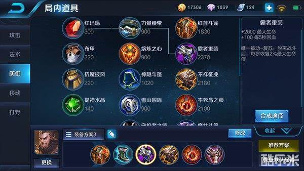 核心装备解析:程咬金的技能伤害很低,而红莲斗篷每秒对附近敌军会造成一定的伤害,这样不仅可以帮助程咬金很好的清兵,同时与对方英雄单挑时程咬金也可以用血量慢慢磨死对方。霸者重装的被动回血可以让程咬金脱离战场没有大招的情况下也能快速回复血量,而且在所有防御装备中霸者重装增加的血量最多,配合着大招回复效果更是无解。而不死鸟之眼的被动更是可以增加血量低于50%的回血力度,这样即使程咬金在血量很低时释放大招也不会被轻易秒杀。