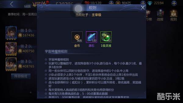 宇宙神魔榜从低到高分为神灵级、界神级、真神级、尊者级、主宰级这5个组,每周一到周日为一个赛季,要想在赛季结束后顺利晋级更高的组别,就要多多挑战对手,获取积分,将自己的排名提升上去!