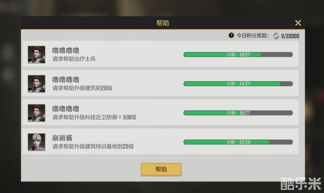 加入军团后,军团成员升级建筑,研发科技,治疗伤兵时,其他军团成员都可以对其帮助减少时间,帮助他人也可以获得军团个人积分奖励。
