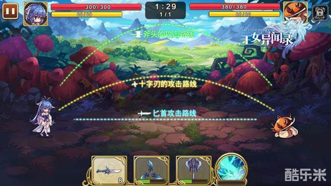 玩过武器投掷类型的玩家都知道,很多投掷游戏的卖点就是收集武器,搭配自己的武器和装备,把握各种时间差来战斗。不过在《王女异闻录》中,虽然也是用了三道弹道且不同高度的武器投掷,以击碎敌人武器从而战胜敌人的战斗方式。但在游戏中每个王女的武器是固定的,根据自身攻击力速度等数值来决定。