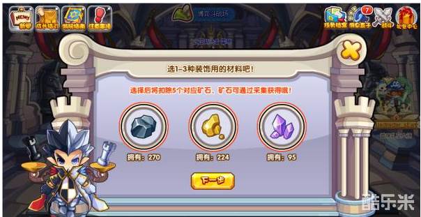1.在博弈战斗场有三块玉石,需要小洛克们选择不同的矿石和宠物进行帮忙雕刻,每天会有七次雕刻机会,雕刻过程需要两分钟。