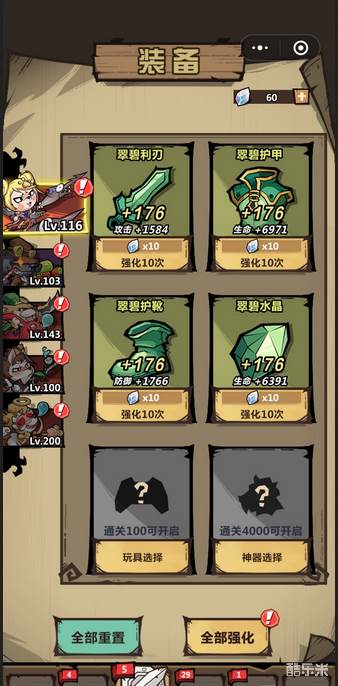 这些就是王者猎人装备进阶需要的材料了,收集的方法也都给各位了,大家按照上面的方法去收集材料就能突破了,注意要在解锁足够的章节之后才能突破,所以新手玩家还要多挂机刷一下进度,达到相应的进度之后就能自由突破了。
