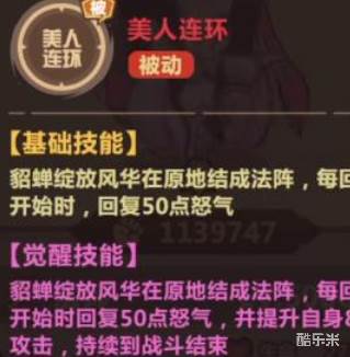 这个角色主要技能被动美人连环,该角色的核心技能,主要就是为角色提升怒气,有了怒气就能无限的释放技能,所以这个技能需优先的觉醒,等玩家觉醒之后每回合能够额外提升怒气,并且提升额外的攻击力,所以需要首先觉醒。