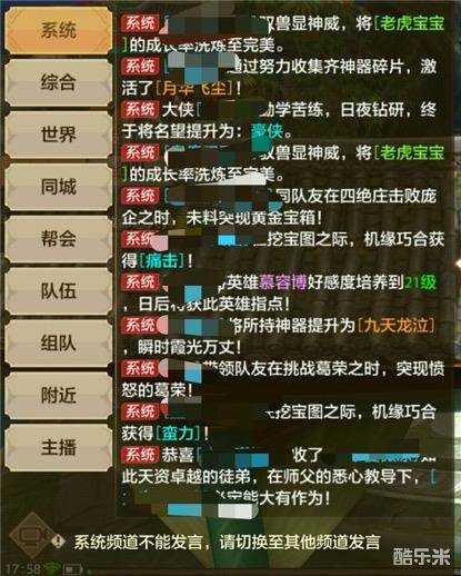 显示系统公告和一些大侠的重要信息,不能发言。例如战斗力提升,得到好宝贝,与哪一位侠士结为莫逆之交之类的,说不定大侠你的名字就在上面出现过多次!