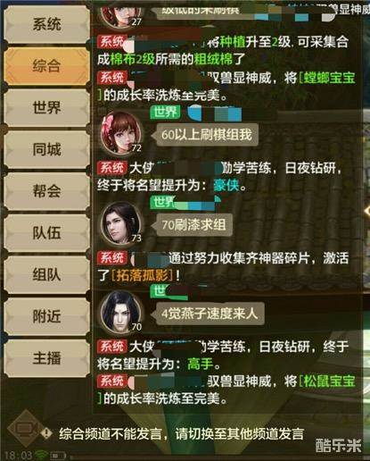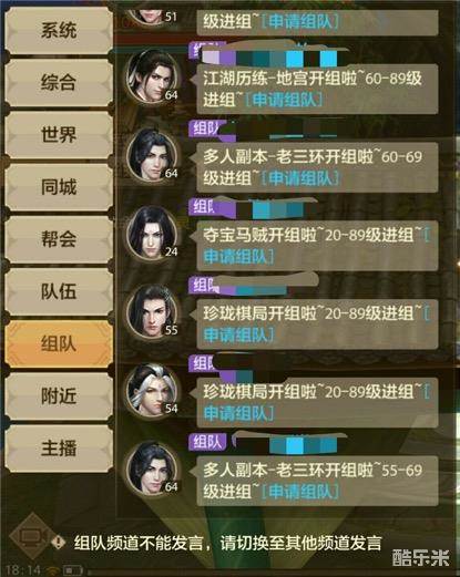 若是发起了游戏组队,就会在这一频道中显示出来,这一频道不能发言。如果大侠有每日任务每完成,或者正愁找不到玩伴,那就可以来组队频道看看,不但可以完成任务开心游戏,说不定还能找到朋友呢。