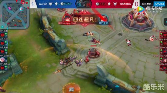 对阵同组的WF战队可能是最接近于让QGhappy战队连胜终结的一场比赛了。首局比赛双方大战24分钟,QGhappy在击杀和经济还处于稍稍领先的情况下却被对手带走胜利。次局再战,WF战队在比赛22分钟的团战当中连续击杀QGhappy四员大将,己方却依旧5人满员。这时QGhappy阵中仅仅只剩下Hurt一人依然在抵抗强压,所有人都以为这场比赛将以WF战队的胜利告终。