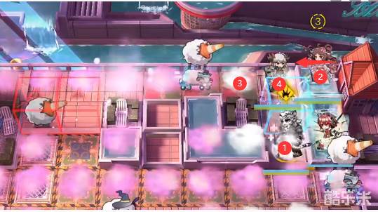 随后如图所示继续部署山(技能好了就开)→ 艾雅法拉(向左)→ 三号位置放个汽水瓶 → 塞雷亚。