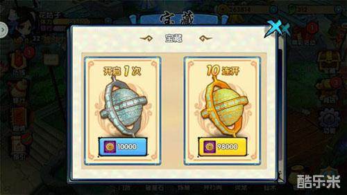 在游戏操作界面右上角,有一个“宝藏”的图标,点击打开宝藏探索界面。这个时候你可以看见一个绿色的旋转的球,和一个黄色的旋转的球。点击绿色旋转的球,是通过消耗金币来进行宝藏探索,点击黄色旋转的球,是通过消耗勾玉来进行宝藏探索。以上两种宝藏探索都是可以选择开启1次或者是10连开。