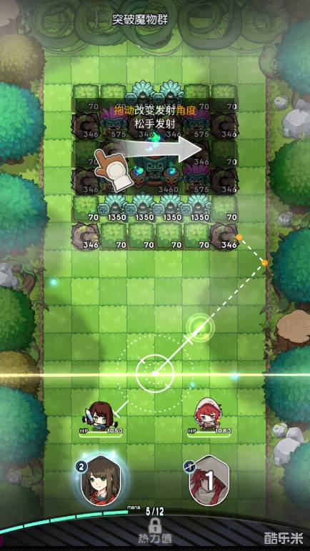 拖动屏幕任意出发射弹珠,进行消除,弹珠的伤害和人物相关,在一般情况下攻击到场地上的敌人或障碍物时弹珠便会进行反弹,如果敌人没有死亡就会进行下一步行动,近战敌人会向前进一步试图攻击,而远程的敌人就会直接进行攻击,而当玩家处理不了怪物导致怪物堵住第一行发射口或者角色血量归零,游戏便会失败。