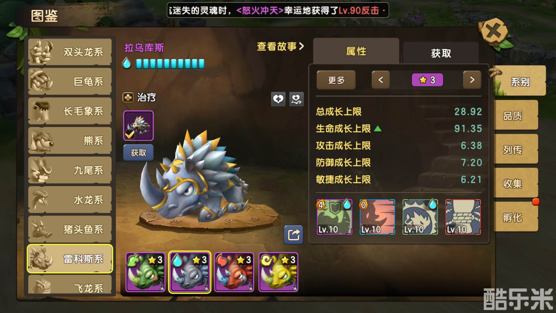 在《新石器时代》里,拉乌库斯宠物只想默默的睡觉,默默的吃草,只想做一只没有忧伤没有烦恼的、安静而又温顺的美丽犀牛,但惹怒它们,即使是布鲁卡或暴龙,面对它的尖角也要避让三分。作为一只带群治疗带回怒的宠物,能对己方随机三个目标回复生命值,并添加1层守护之盾,持续两个回合。值得一提的是,当治疗对象为水属性的宠物时候,可额外恢复1怒气,所以在水队中,拉乌库斯是首选萌宠!