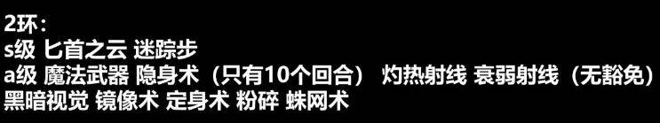 A级:魔法武器、隐身术(只有10个回合)、灼热射线、衰弱射线(无豁免)、黑暗视觉、镜像术、定身术、粉碎蛛网术;