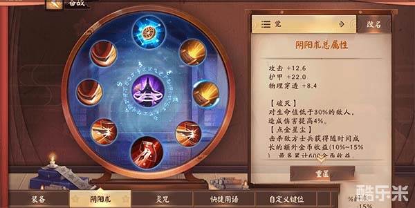 阴阳术选择星,团战时先用大招,跳进去转两下就叠满了。因为我认为觉的优势不在于对线,所以放弃了偏向对线的豹袭和占卜之印。因为肉装伤害不高,打出豹眼的机会也不多。团战时的作用主要为输出和限制对方脆皮,所以就定位来看也不适合言灵守。