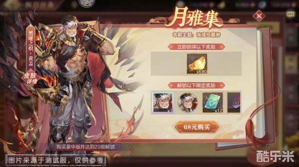 更有每月一款史诗级武将皮肤载入月雅集,68元付费解锁“月雅集豪华版”并达到20级即可特惠获取,还有本期限定招募券、海量资源等你来领!