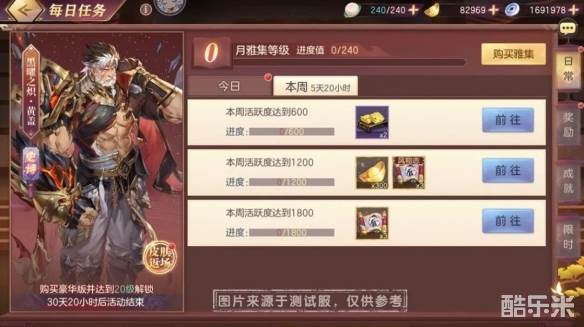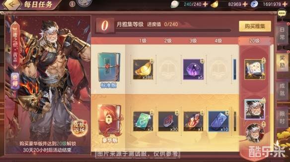 小将军可以通过每个月度完成【每日任务】获取月雅集进度,将解锁额外的【月雅集】标准奖励。另外,68元付费解锁【月雅集豪华版】后,达成指定等级可额外获得每月限定史诗级皮肤、主题奖励(本月为唤魂招募券)等资源,助力小将军闪耀三国!同时,月雅集皮肤常驻返场将更换为航海日志·鲁肃!